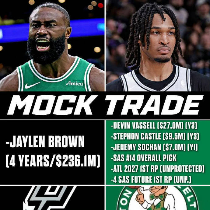 疯狂!美媒建议马刺用3人+6首轮梭哈杰伦-布朗 admin 2025年06月20日 17:30 83 0 北京时间2025年6月20日,美媒给出了有关杰伦-布朗的交易方案。具体如下:马刺得到:杰伦-布朗(4年2.36亿美元)凯尔特人得到:德文-瓦塞尔、史蒂芬-卡斯尔、杰里米-索汉、今年马刺14号签、2027年未保护首轮(来自老鹰)、4个马刺的未来首轮签各位觉得这个报价如何?(搜狐体育编辑:JS) 标签: #梭哈杰伦 #卡斯尔 #史蒂芬 #建议 #索汉 #首轮 #瓦塞尔 #马刺 #报价 #布朗 #消息资讯 #凯尔特人 #搜狐体育 #美媒 #老鹰